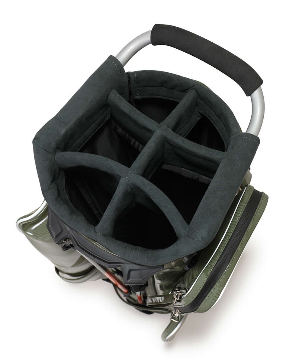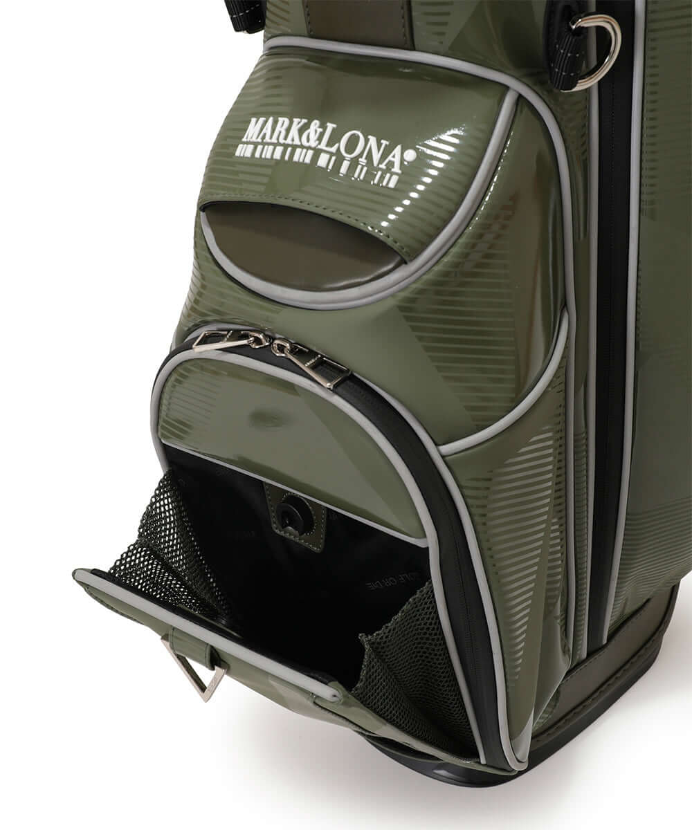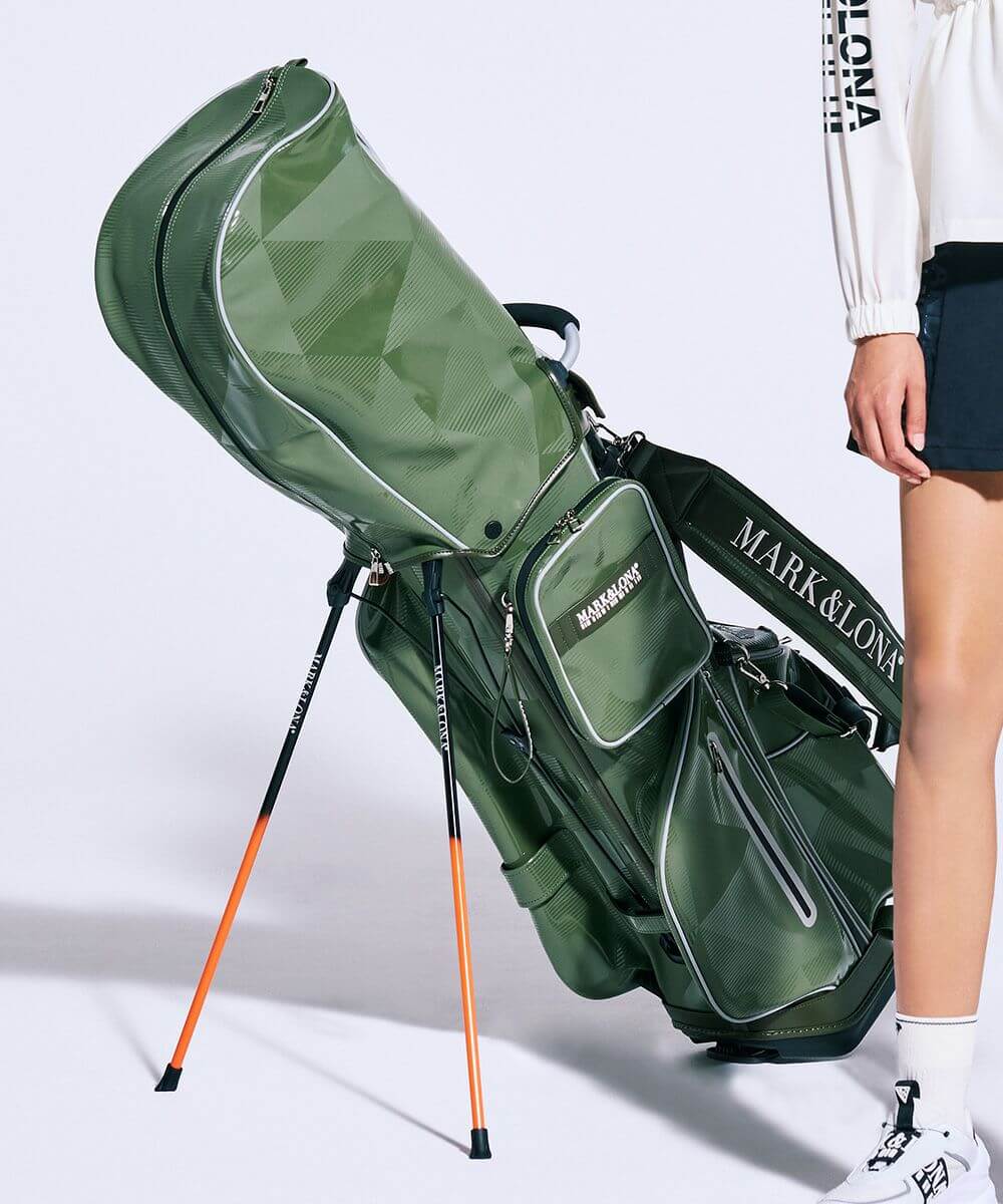 A lightweight stand 3-way caddy bag with a geometric pattern printed with thick transparent resin on rubber-touch surface treated fabric.