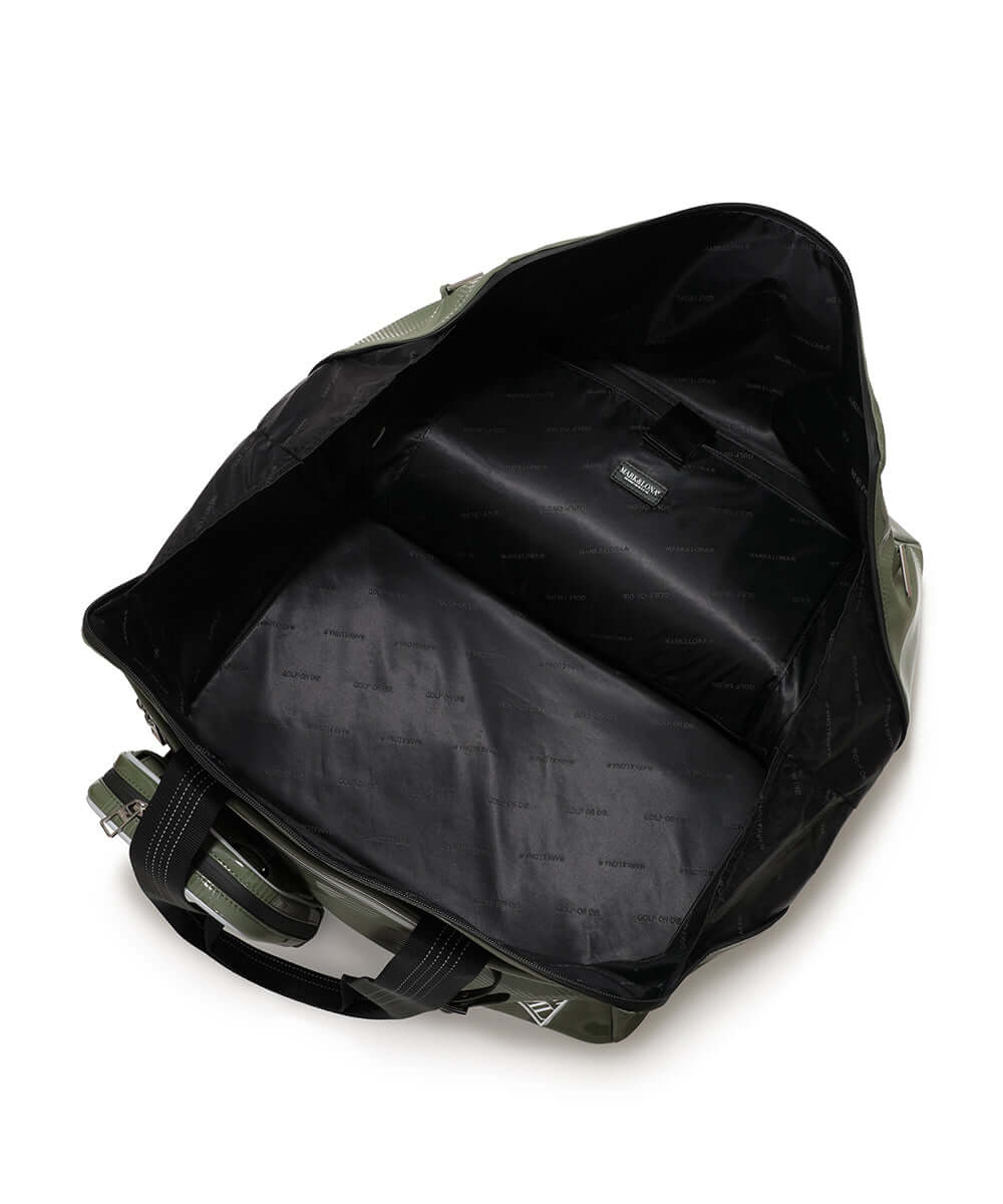 A 4-way Boston bag with a geometric pattern printed with thick transparent resin ink on a rubber-touch surface-treated fabric.