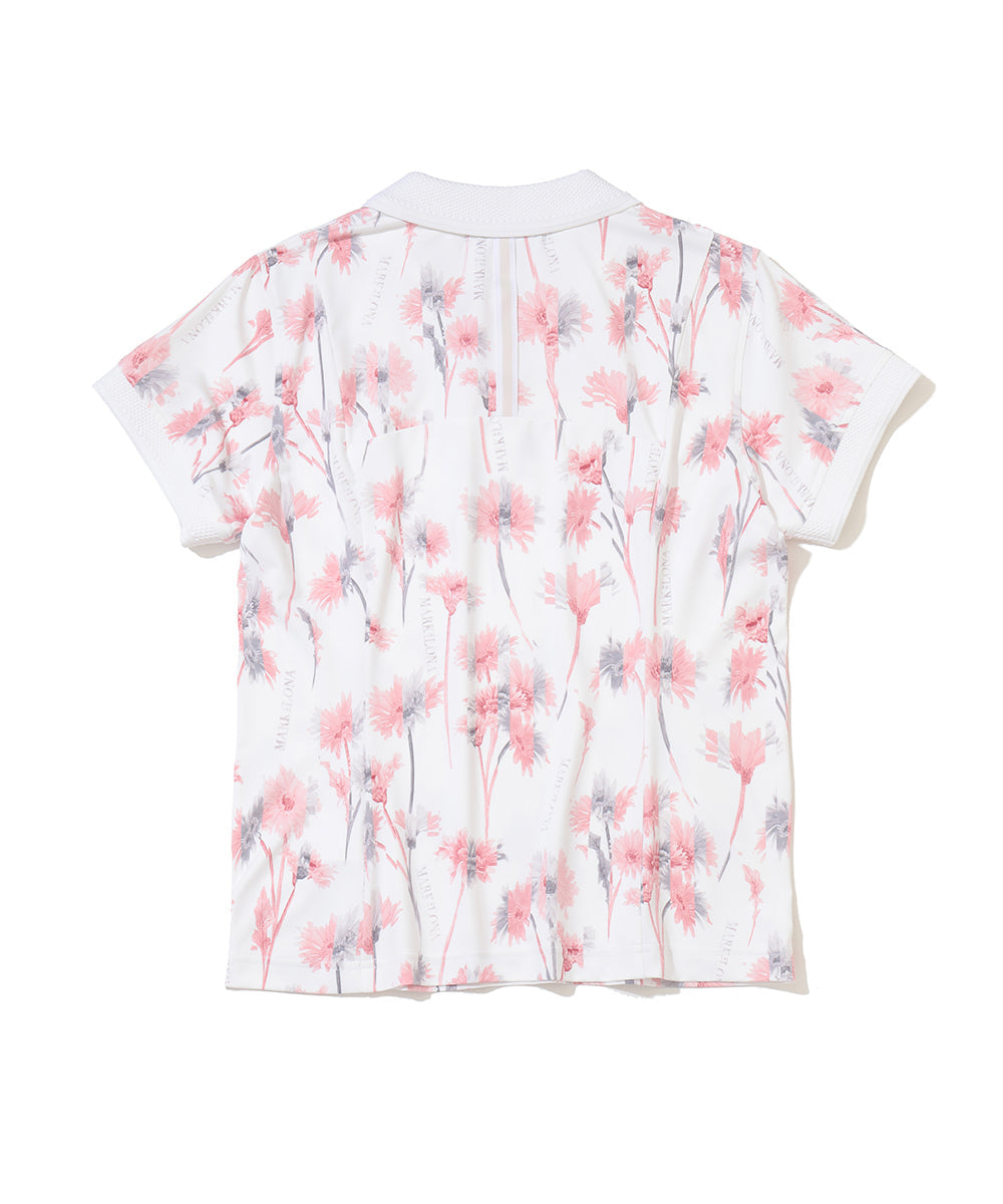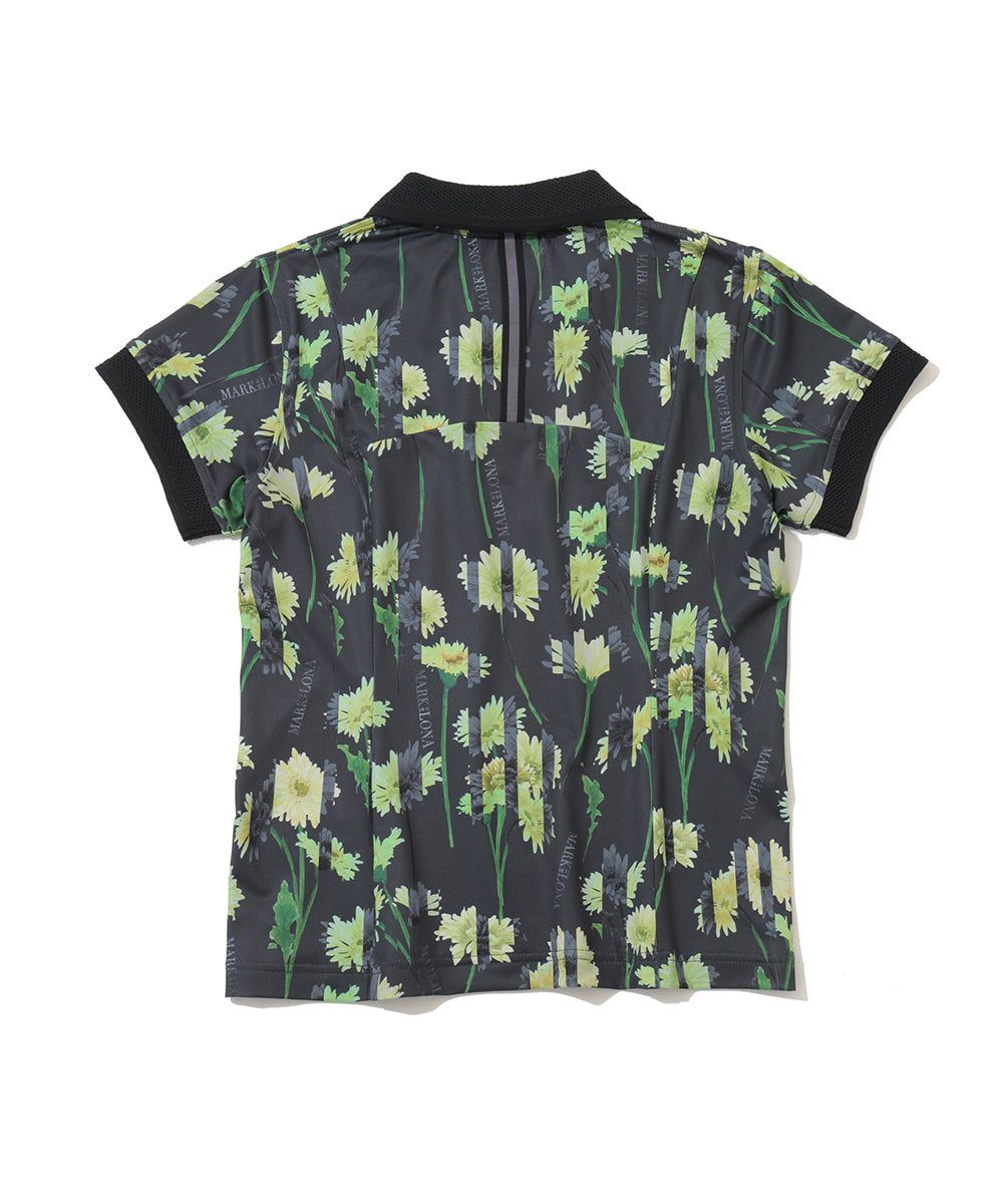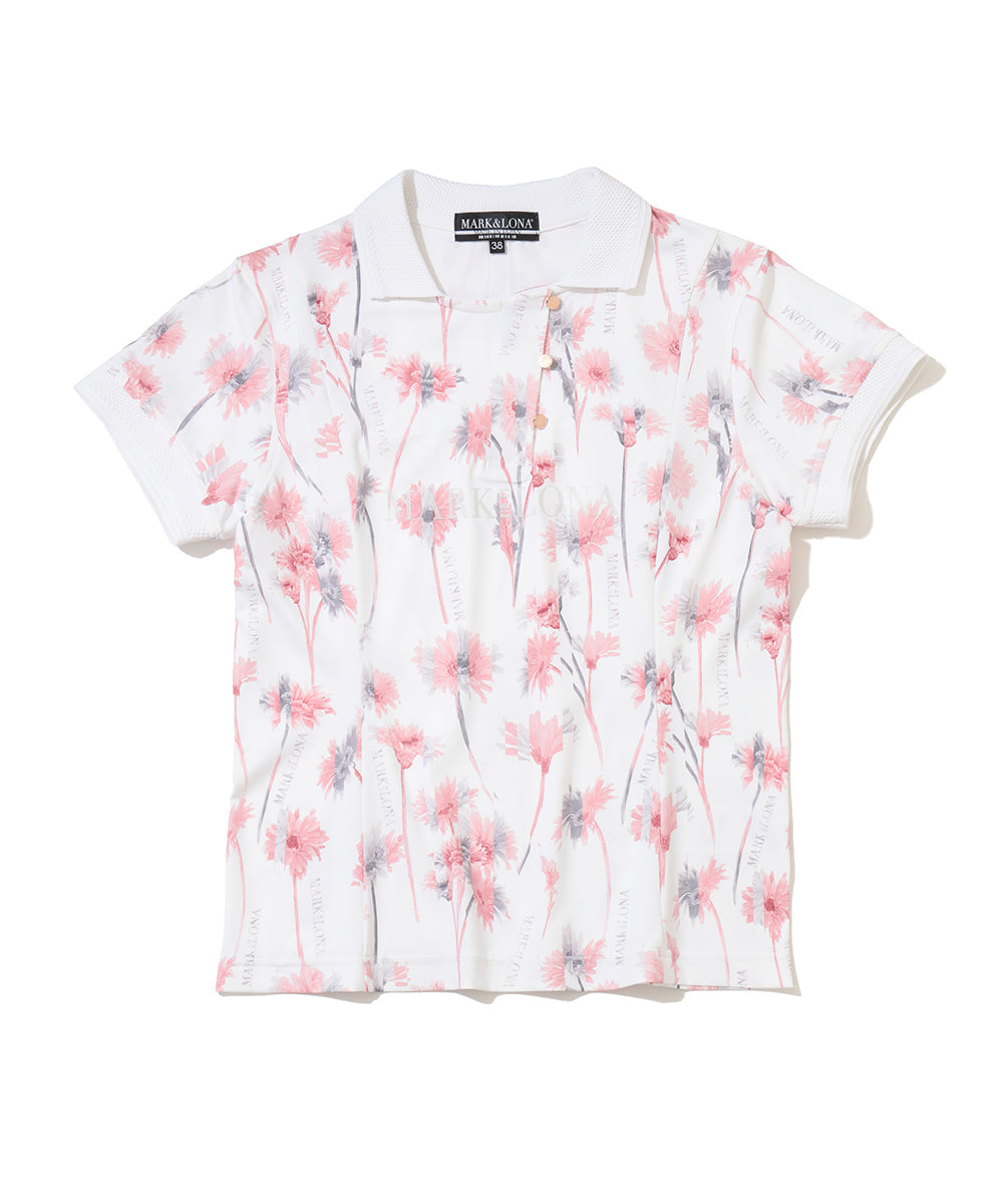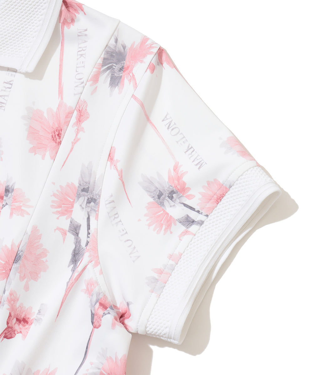 An all-over print polo shirt featuring delicate floral motifs expressed with three-dimensional shading.