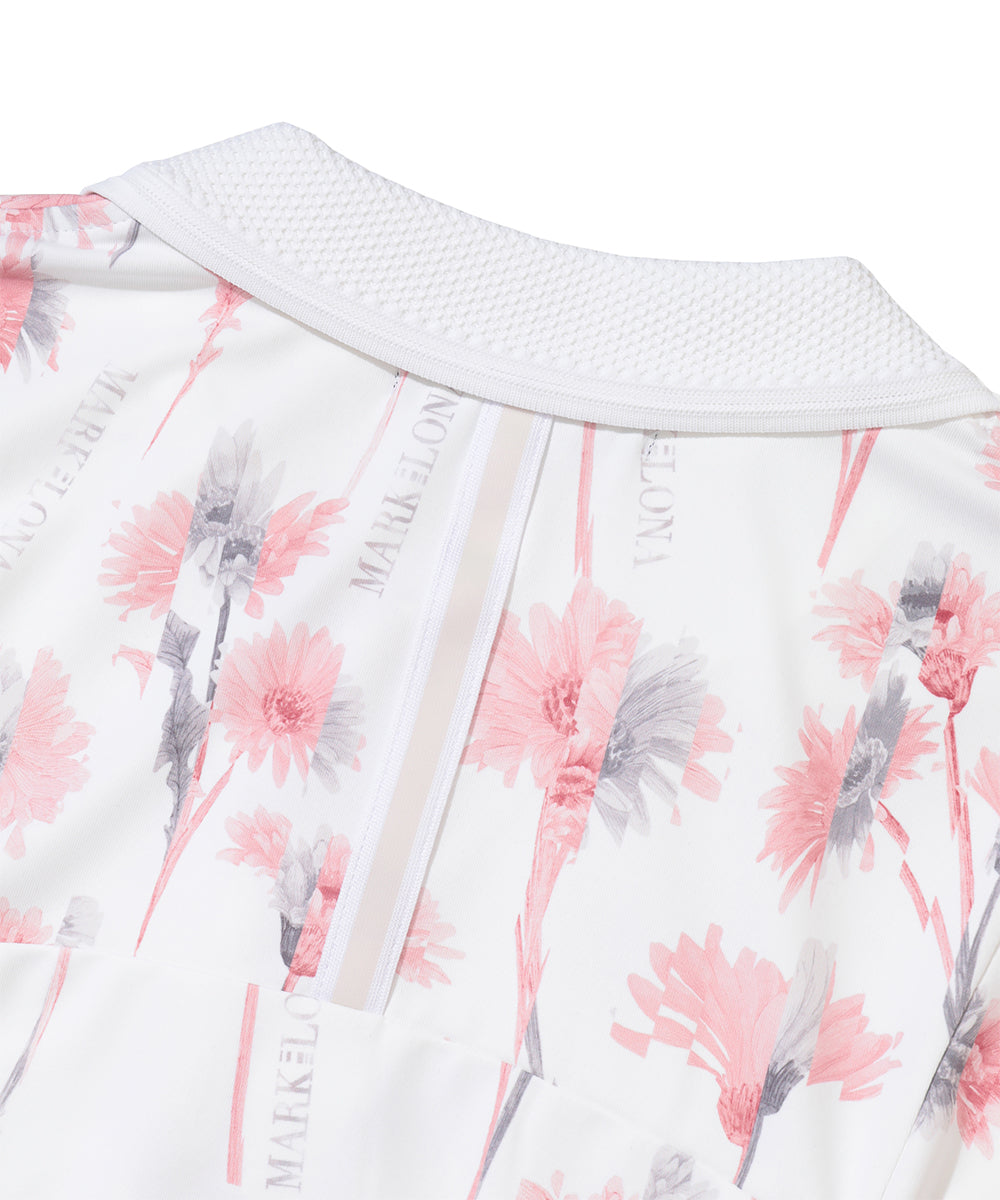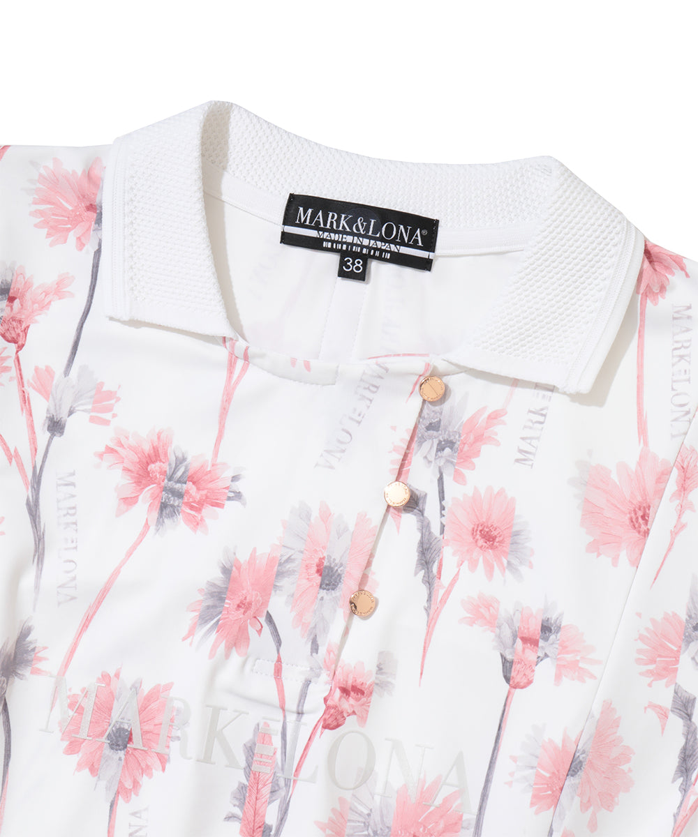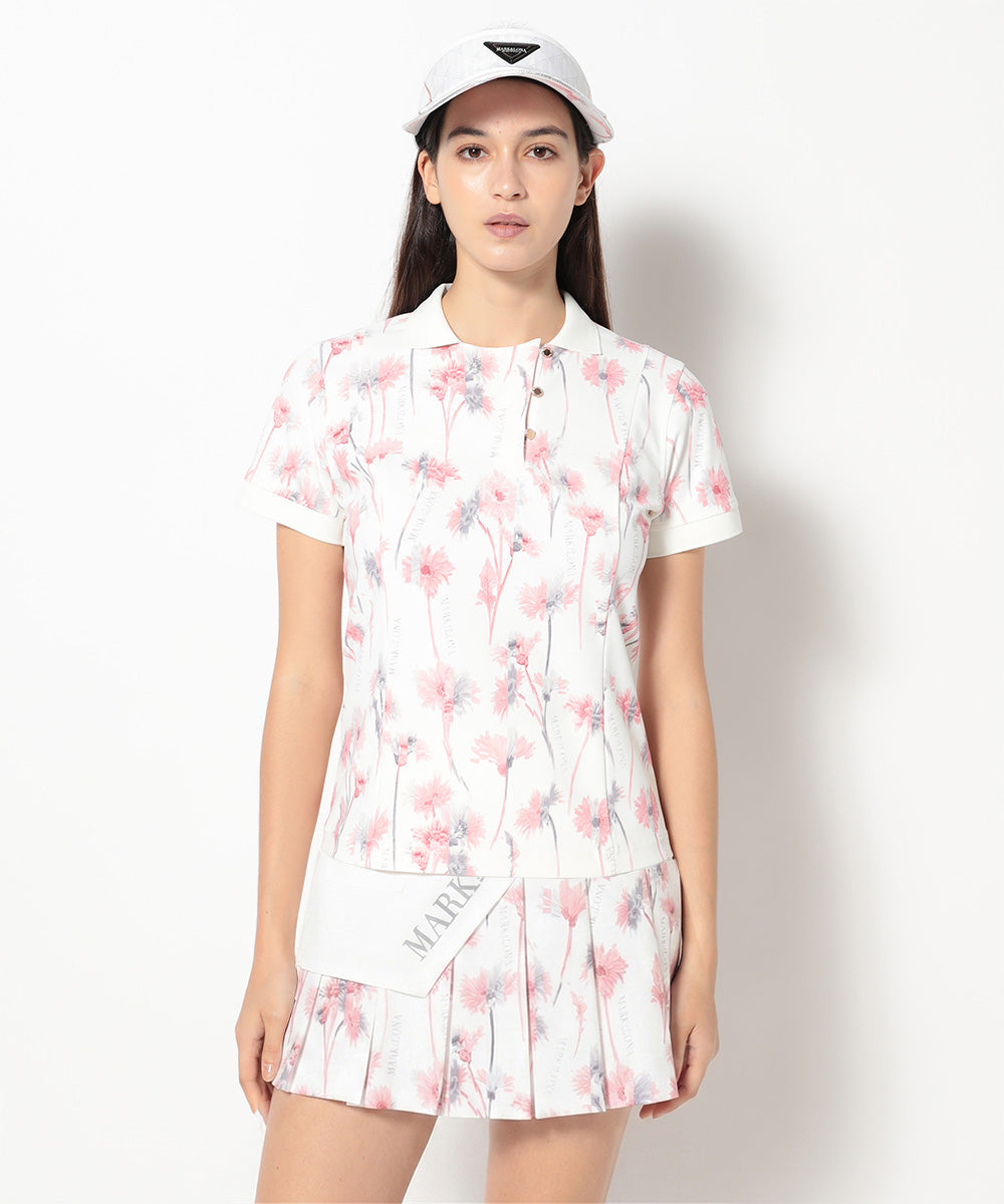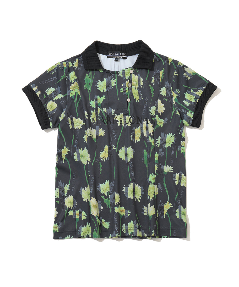 An all-over print polo shirt featuring delicate floral motifs expressed with three-dimensional shading.