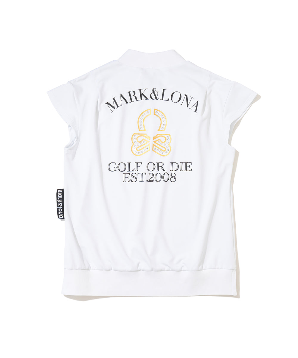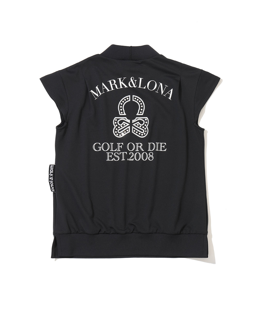 A high-performance mock neck T-shirt featuring a striking back design with a sparkling rhinestone-embellished element skull print.