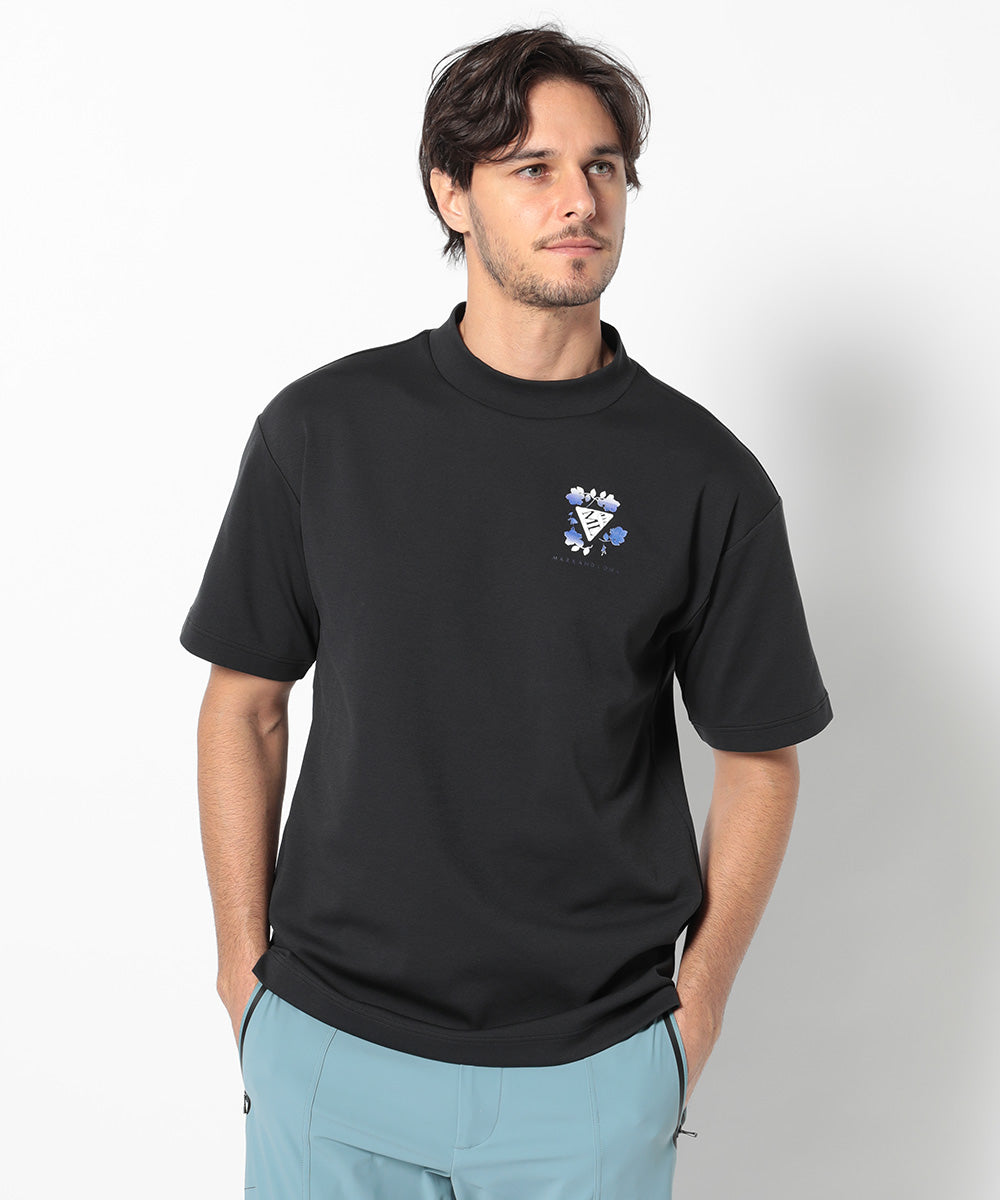 An iconic mock neck T-shirt with a print that mixes the triangle logo and hibiscus on the front and pack. Made of powder-touch polyester material with just the right amount of stretch. A sophisticated style with plenty of room around the body and shoulders, while sharpening the collar and sleeves. Regular fit silhouette that follows the natural lines of your body.