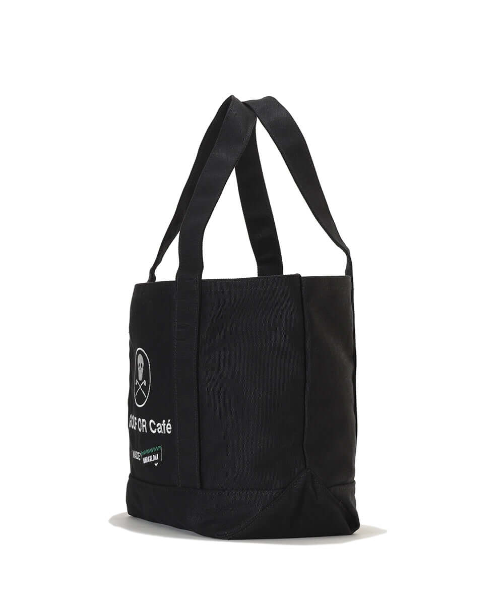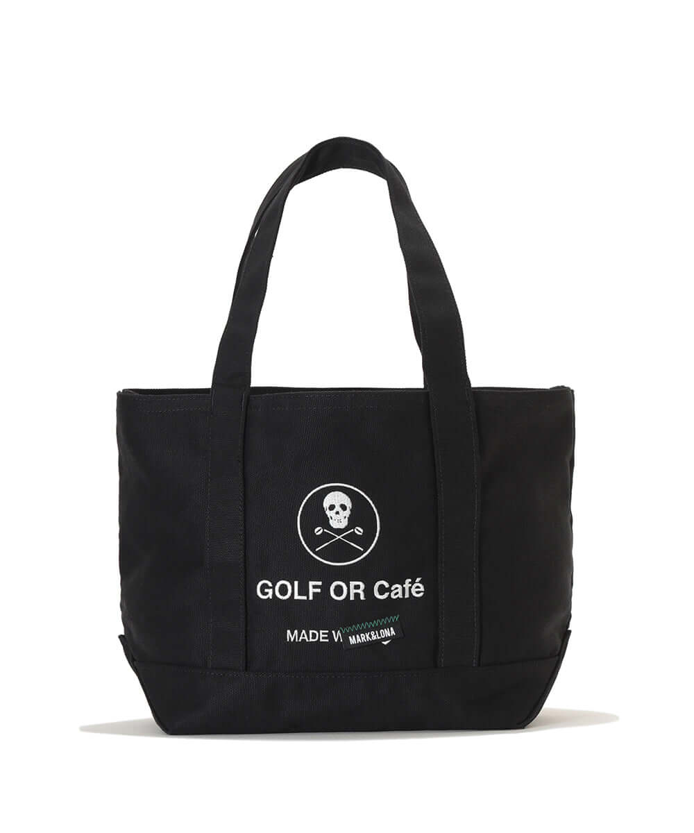 "GOLF OR Café" Black Tote Bag. A hidden message adds a unique touch beneath a green houndstooth-stitched brand tag, inspired by the look of a golf green. Made from ultra-durable 16.5 oz. heavy canvas, this tote is designed for everyday use, offering strength and resilience. The fabric’s character deepens with use, developing a rich patina over time.