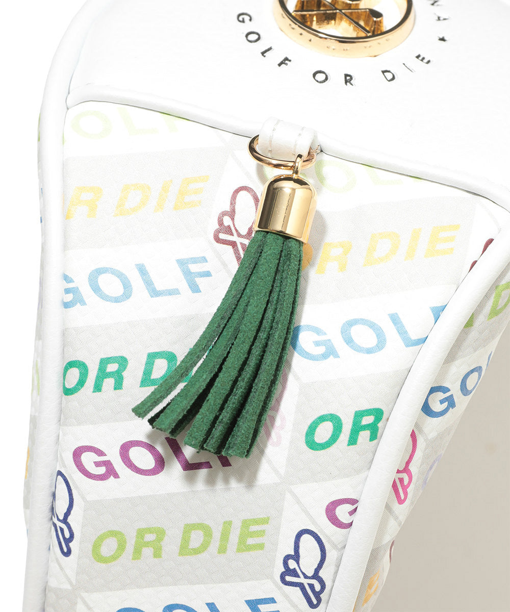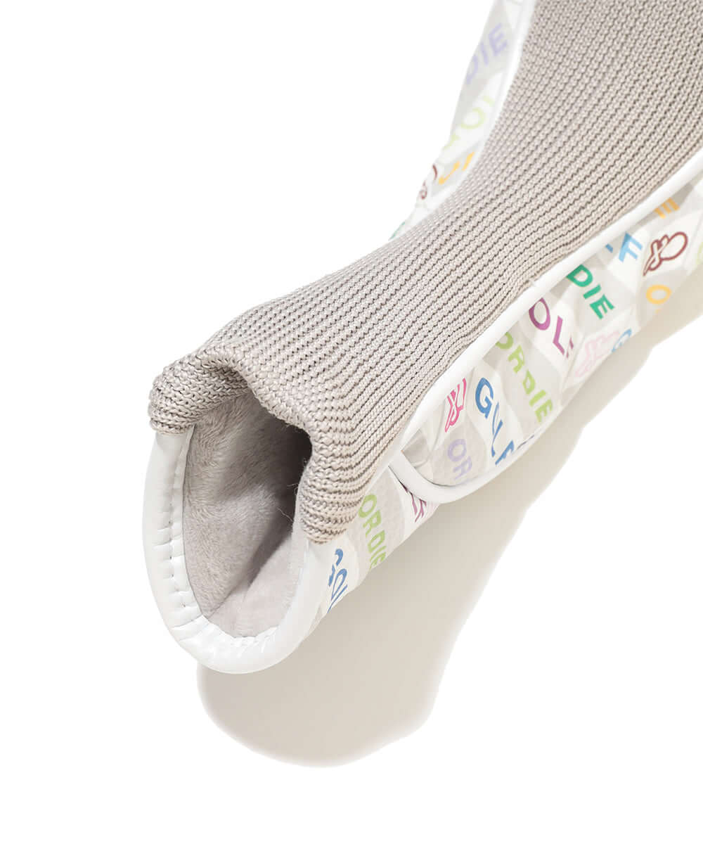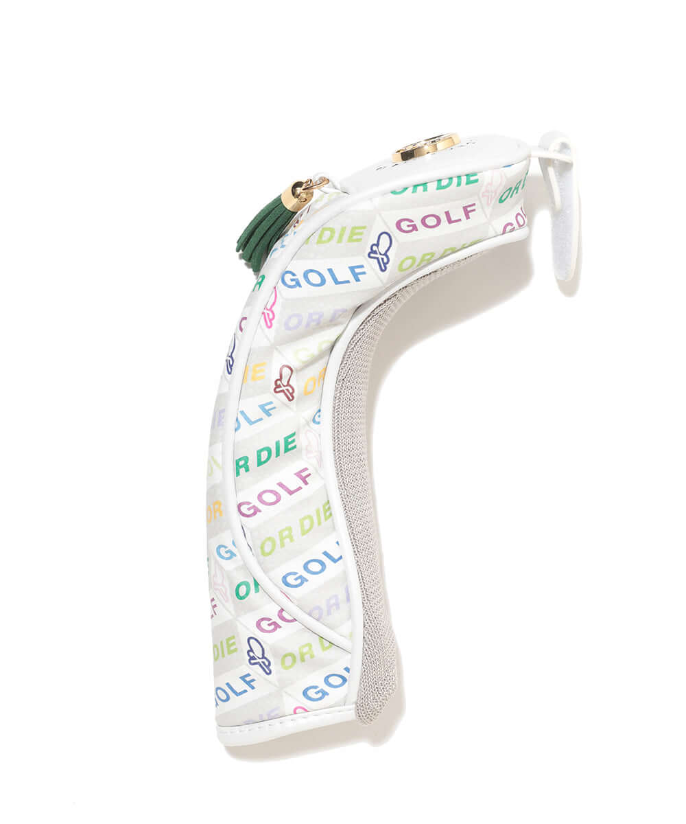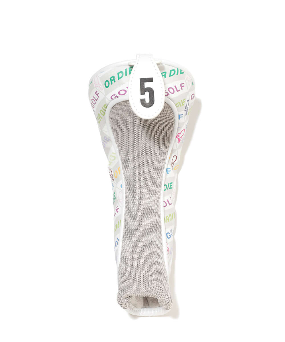 This utility club headcover features an eye-catching geometric pattern composed of multicolored lettering.