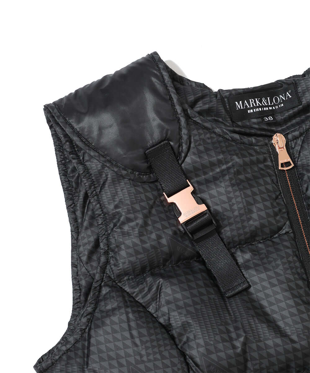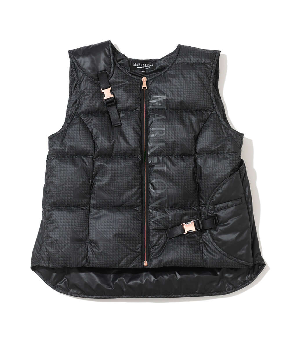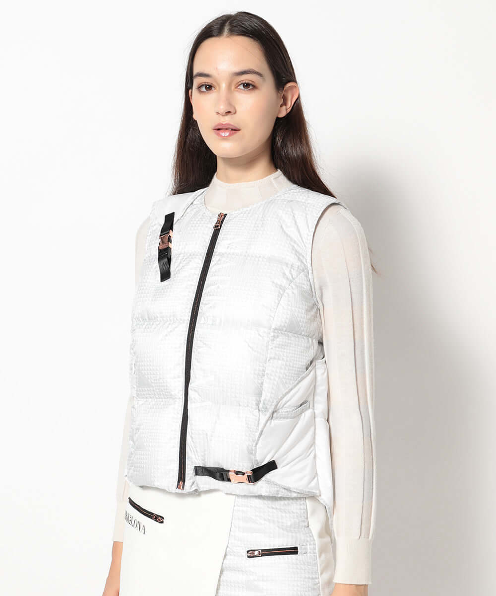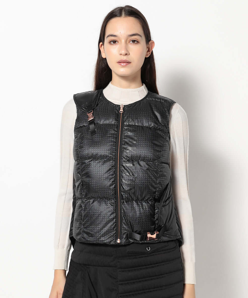 This down vest features an asymmetrical design. The original glen check pattern subtly incorporates the brand's iconic triangle motif.