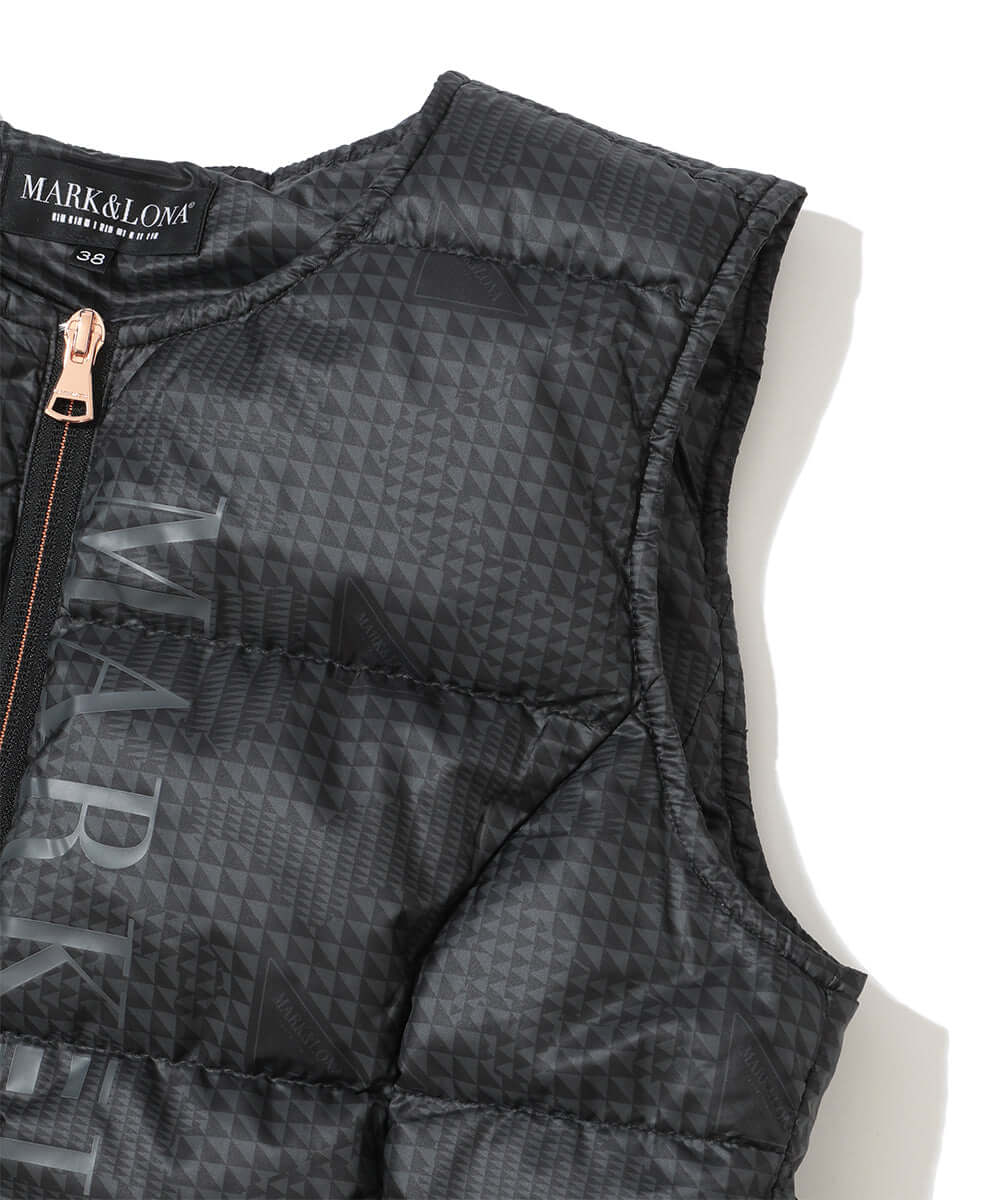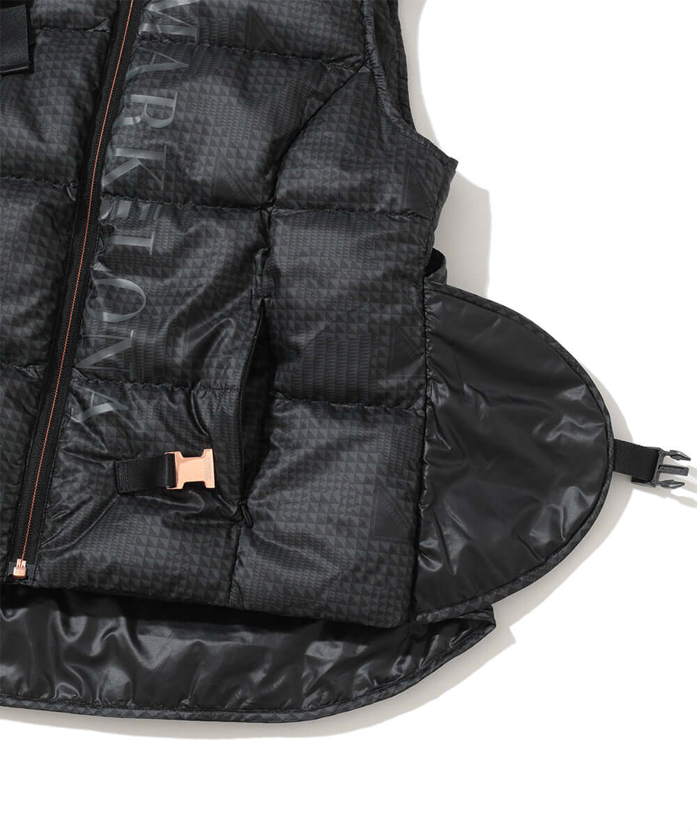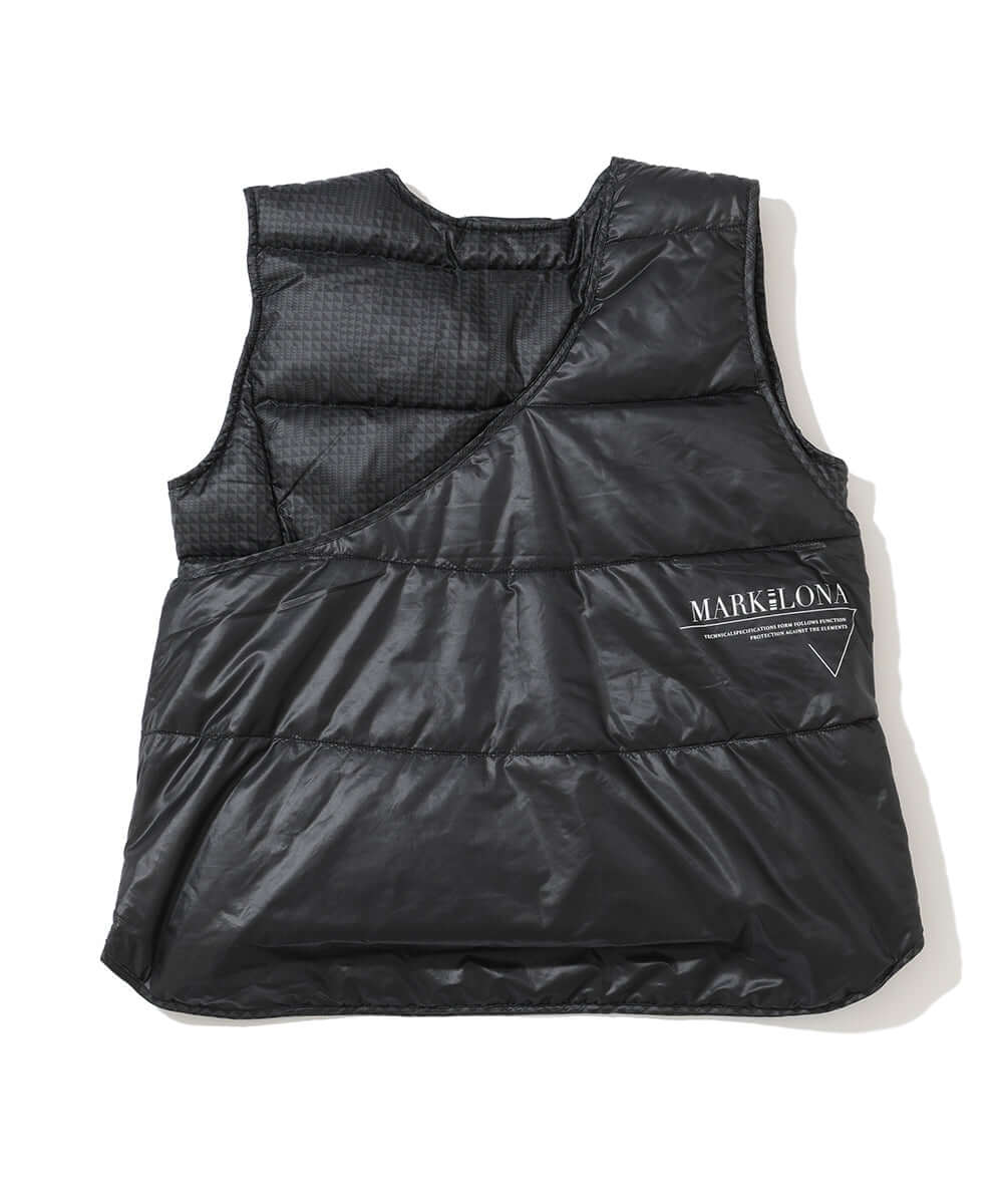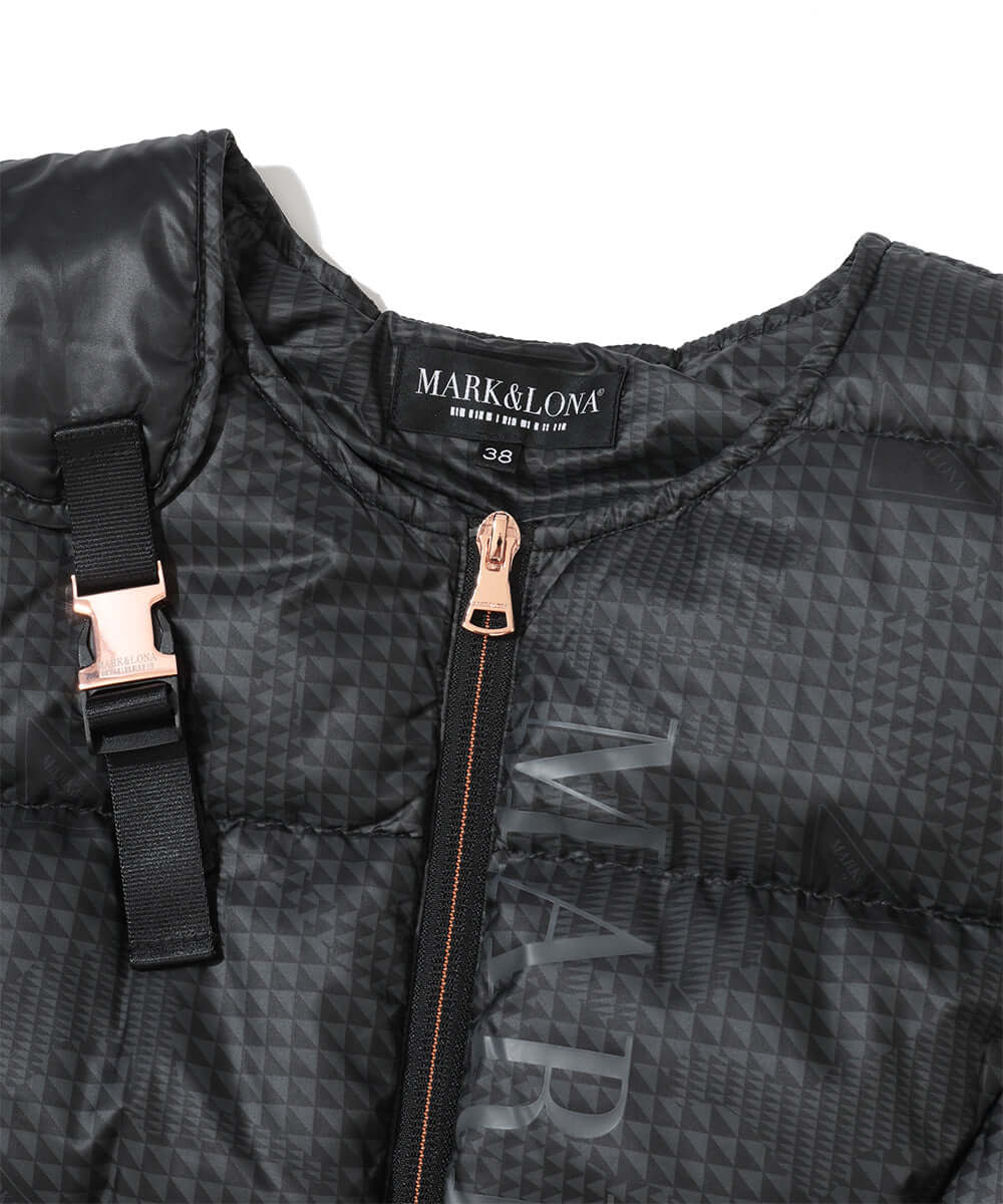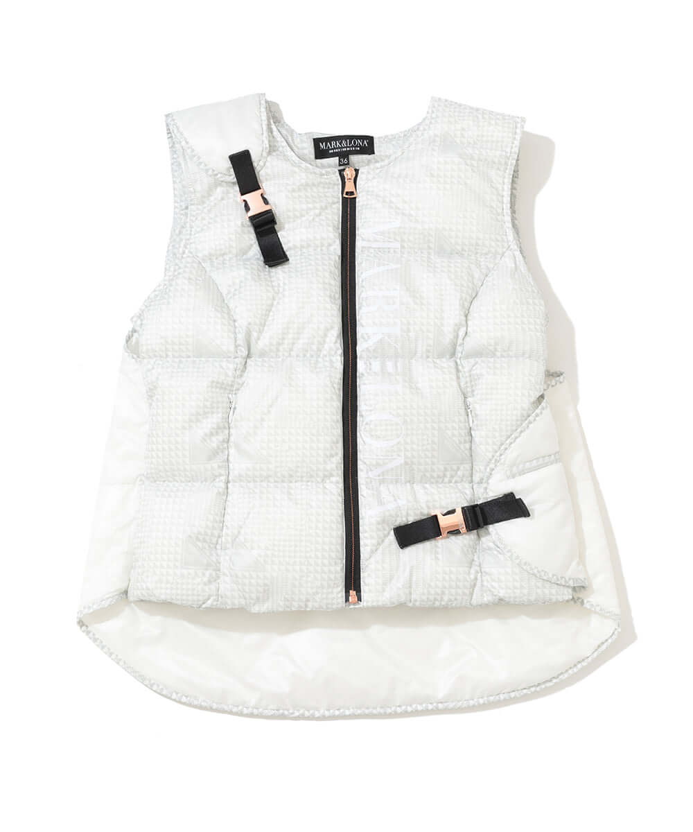 This down vest features an asymmetrical design. The original glen check pattern subtly incorporates the brand's iconic triangle motif.