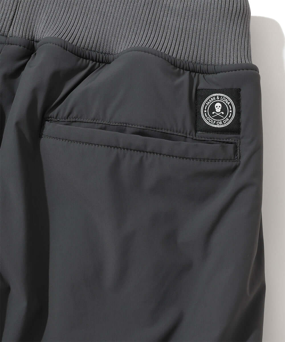 ・Bold embroidery on both sides and nylon taffeta accents on the pocket openings and hips create a contrasting material combination design.
