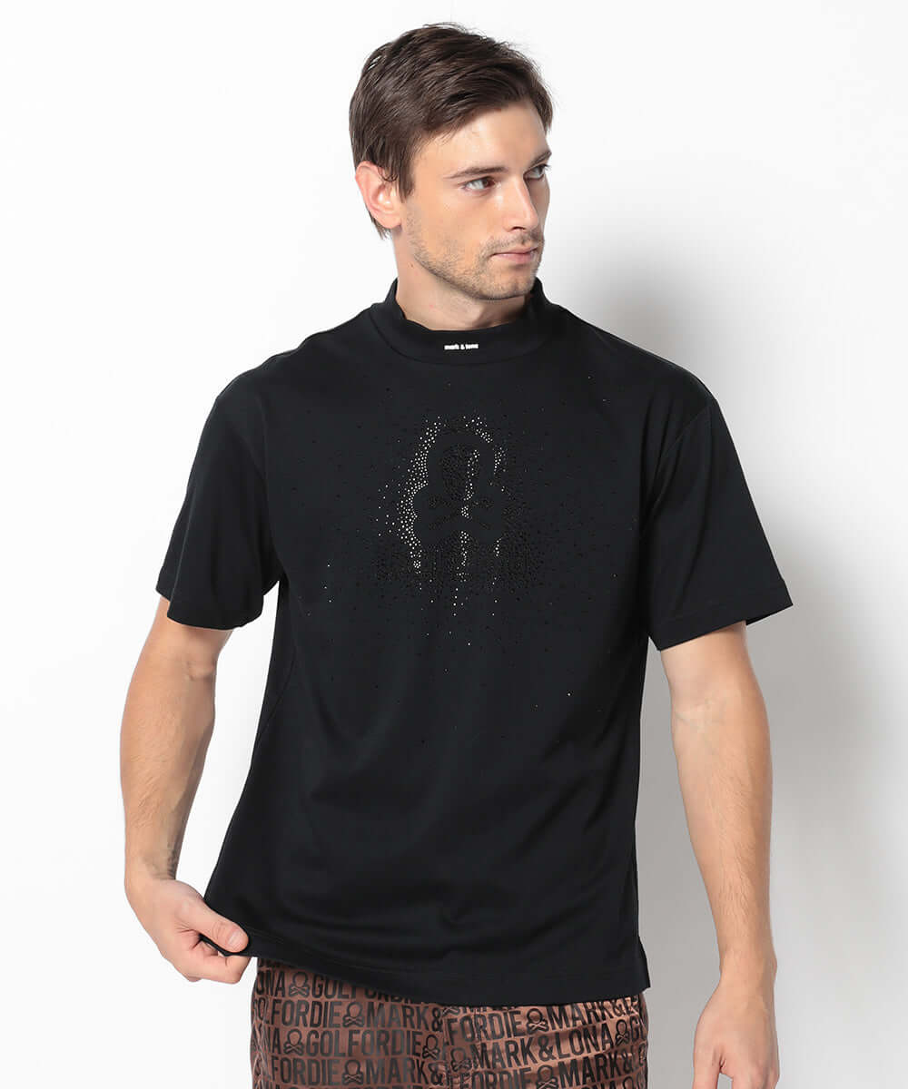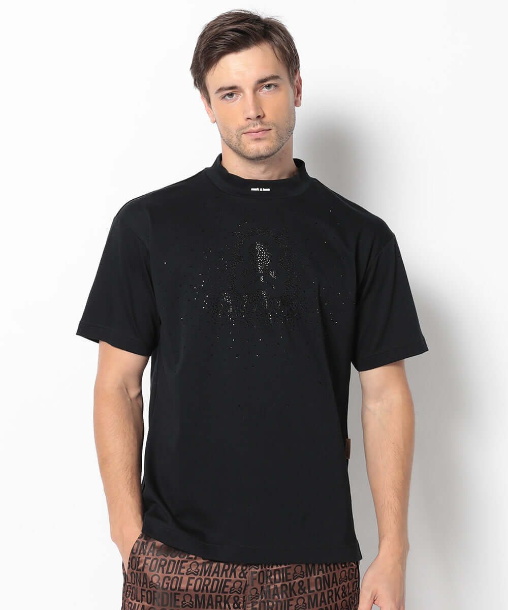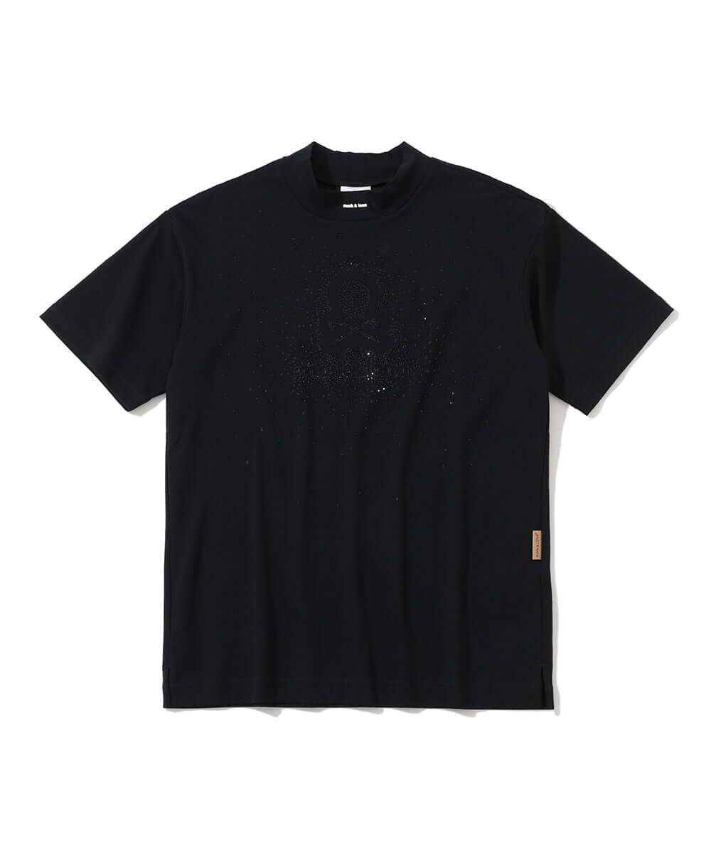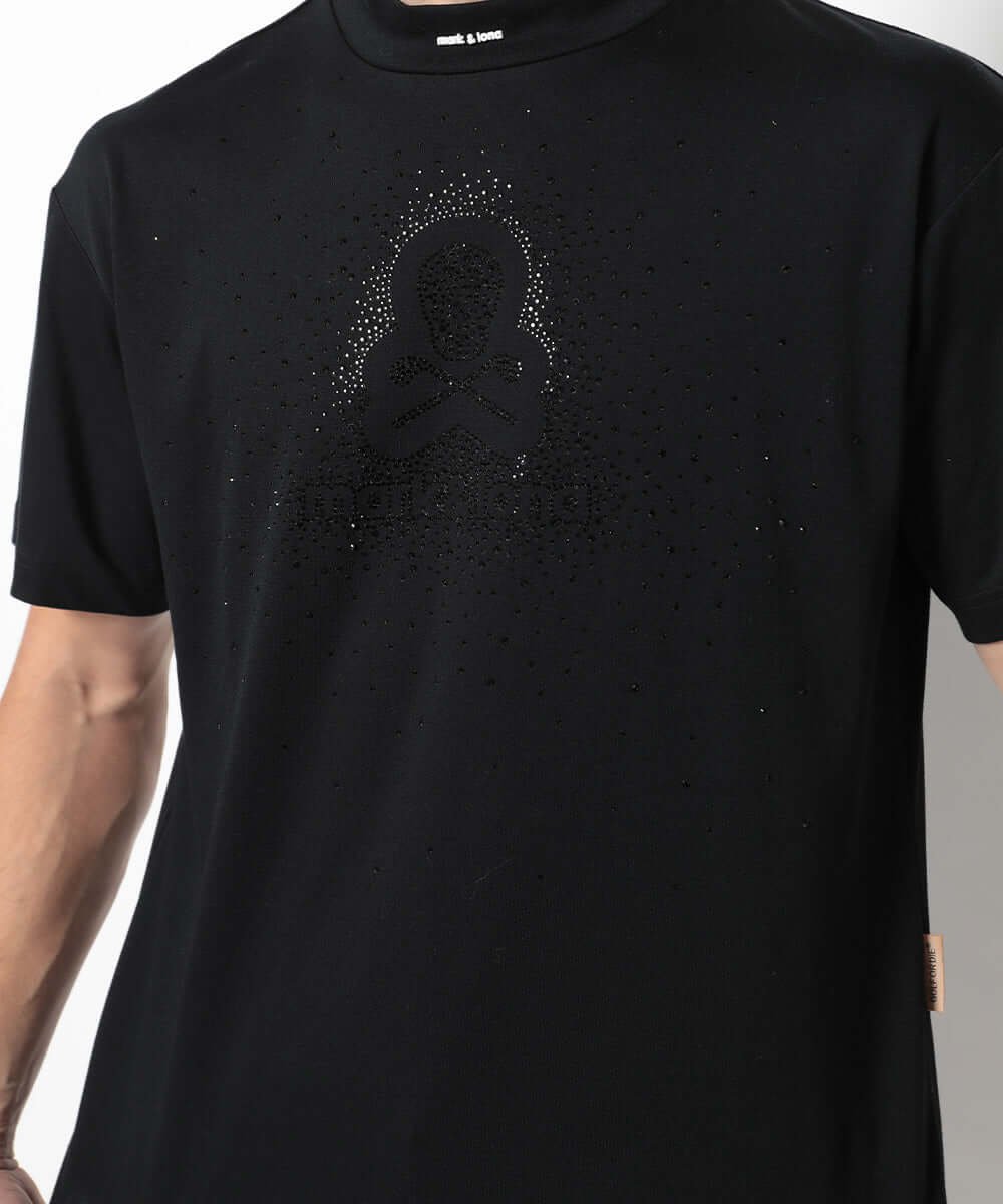 A luxurious and highly functional mock neck T-shirt featuring a striking skull and sparkling crystal stones.
