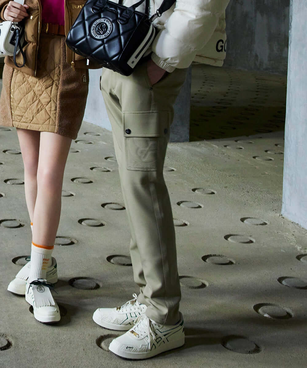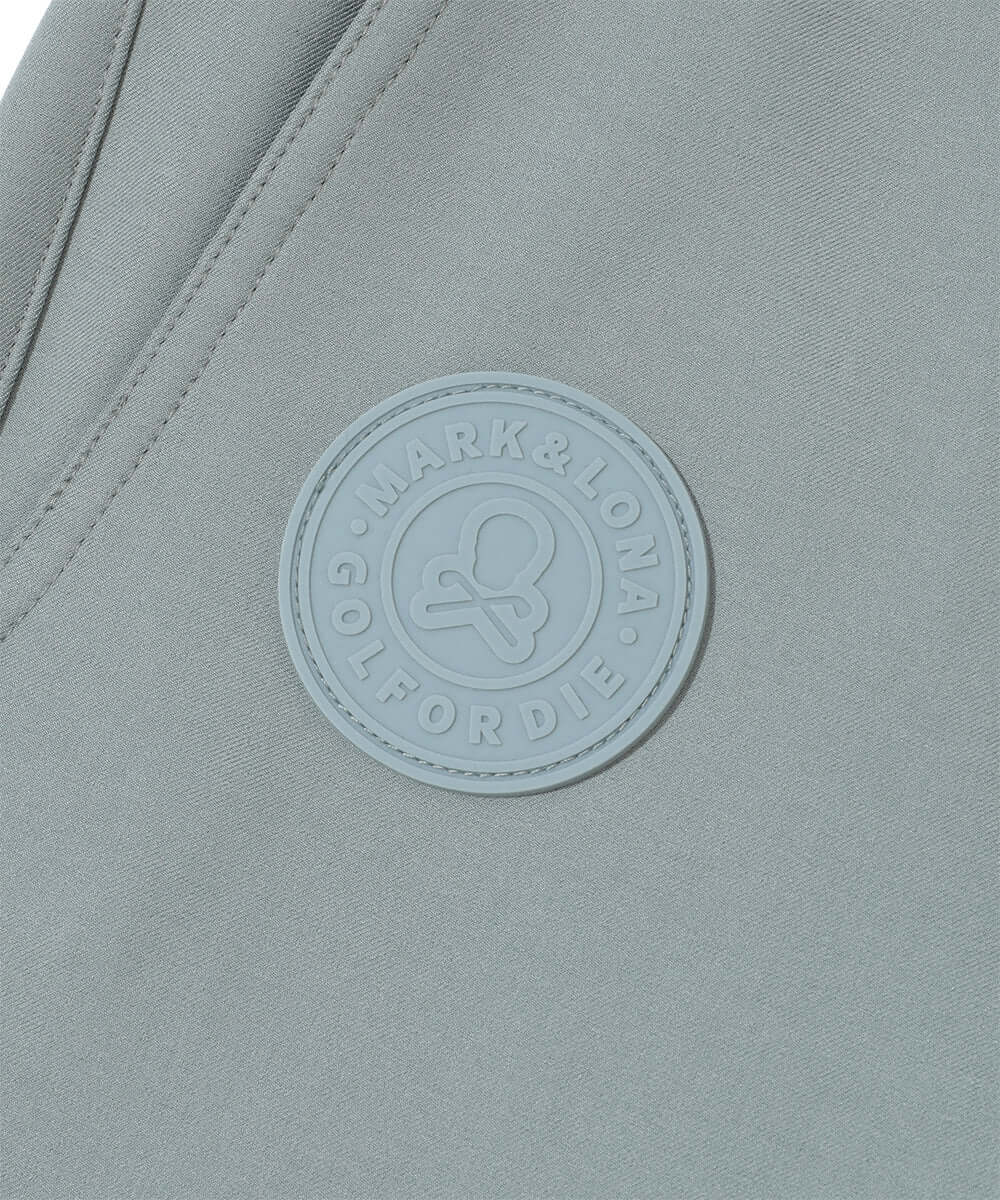 ・A logo-printed patch pocket is located on the left side, and a three-dimensional silicone patch is located on the right side.