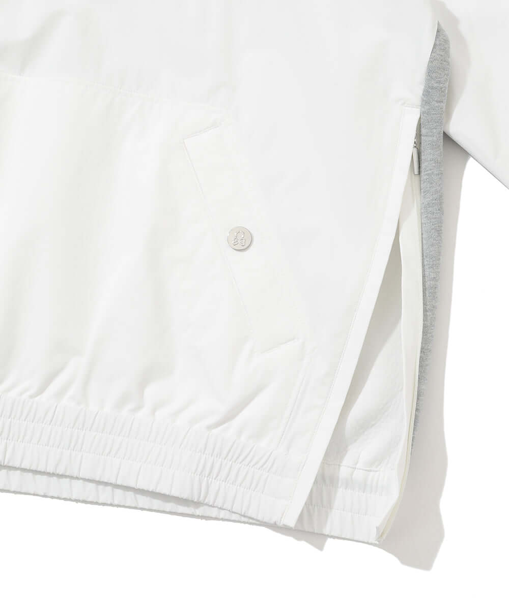 This stand-collar pullover is a hybrid of different materials, combining stretch nylon taffeta and bonded cotton jersey.