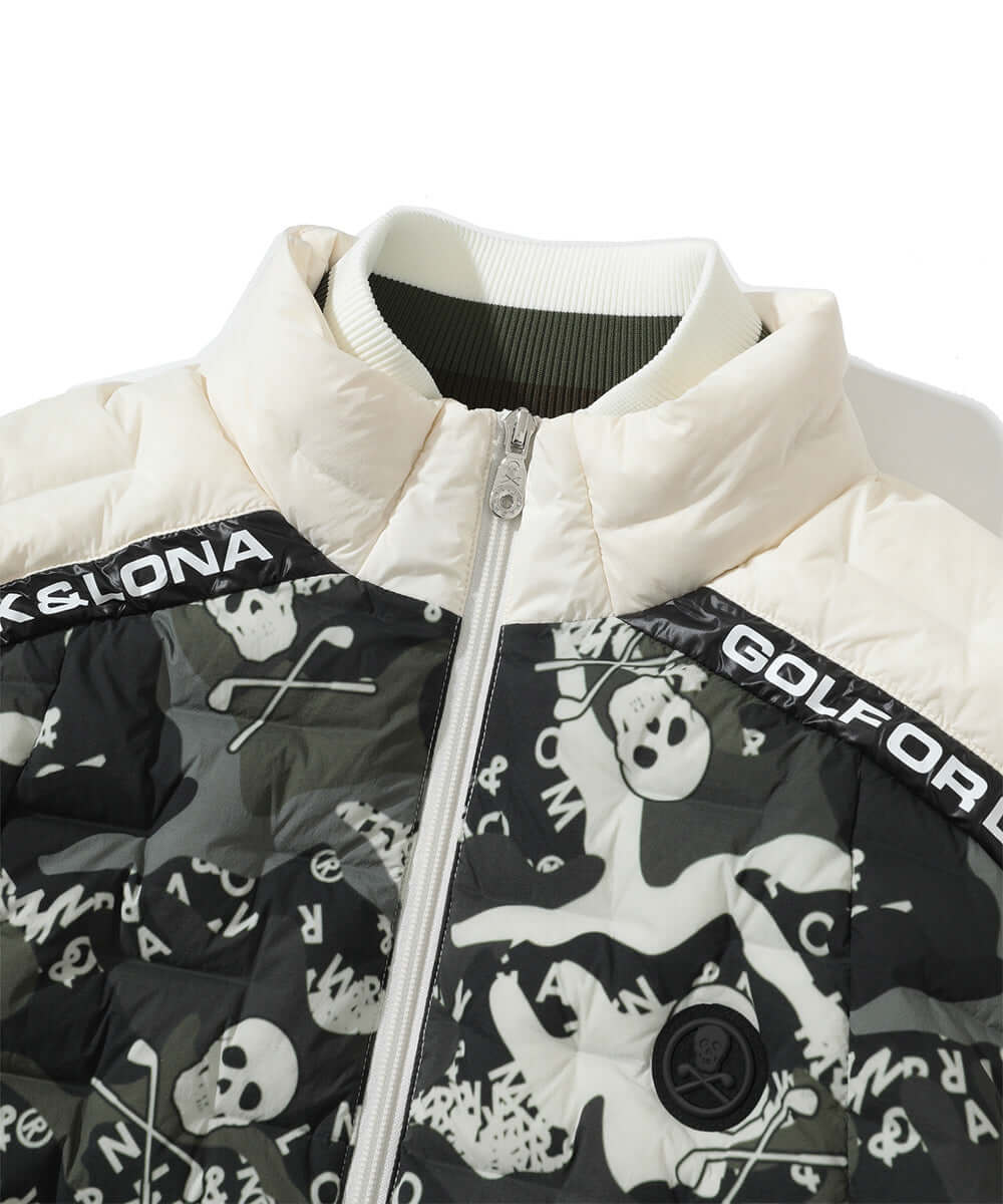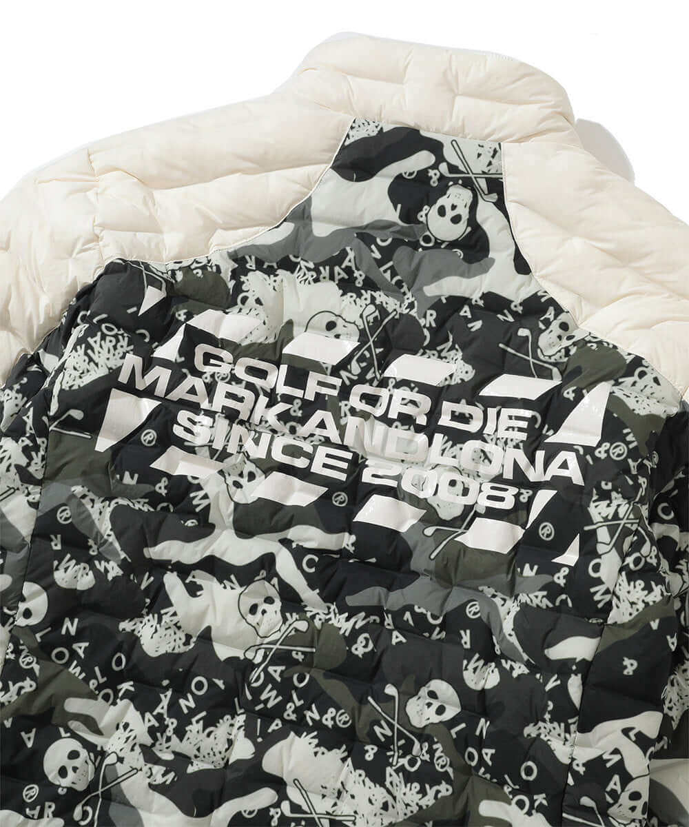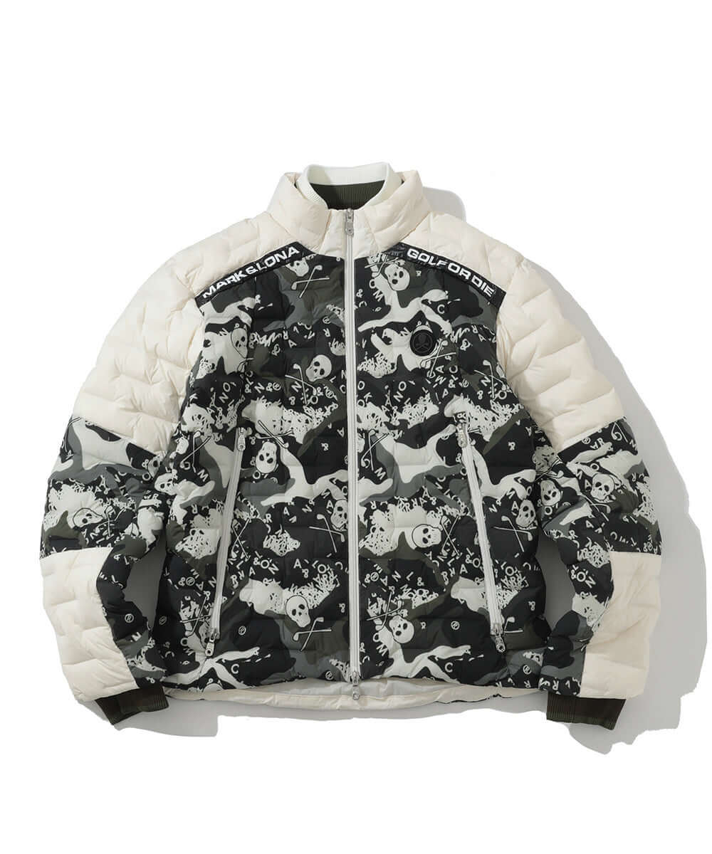 Seamless down jacket. A tight-fitting silhouette that takes advantage of the characteristics of the material. The main body is made of durable high stretch material and has a skull x camouflage pattern. In addition, The inside is filled with high-quality down with over 700 fill power, providing excellent heat retention even on cold days.