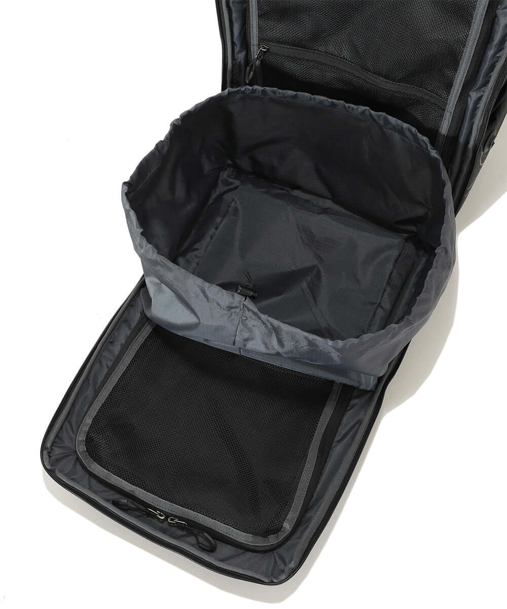 ・When the main zipper is opened, the inner lid is equipped with a deep zipper pocket + a drawstring compartment for storing shoes.